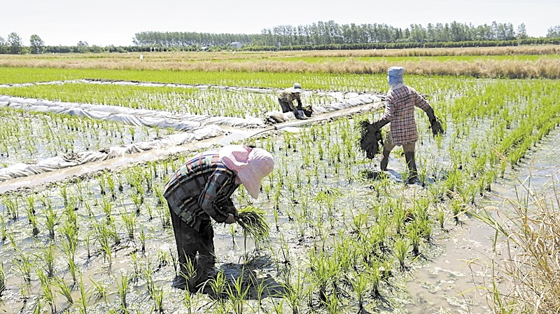 村民在农药化肥减量核心区补秧。