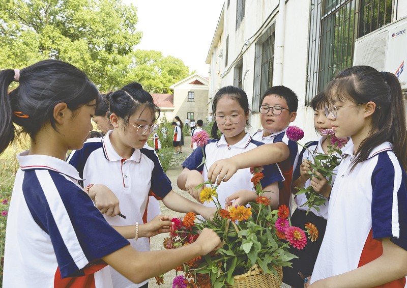 学生们采摘自己种植的鲜花,作为教师节礼物送给老师。