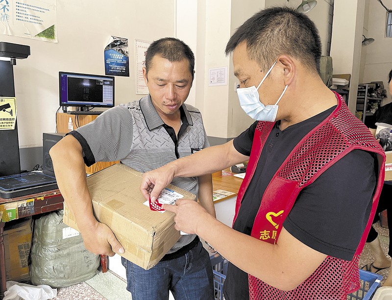 ▲ 志愿者在镇上的各个快递点给包裹贴上反诈禁毒爱心小贴士。