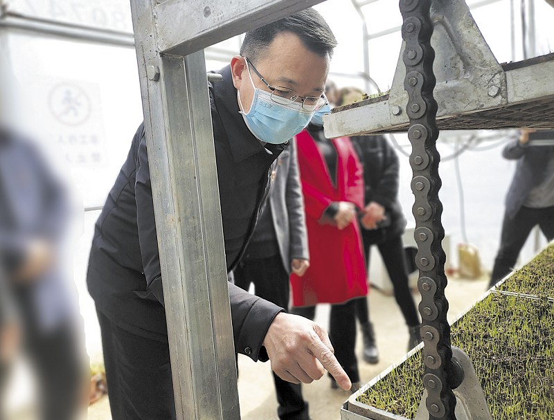 县委书记石录明在乐安镇察看早稻集中育秧情况。