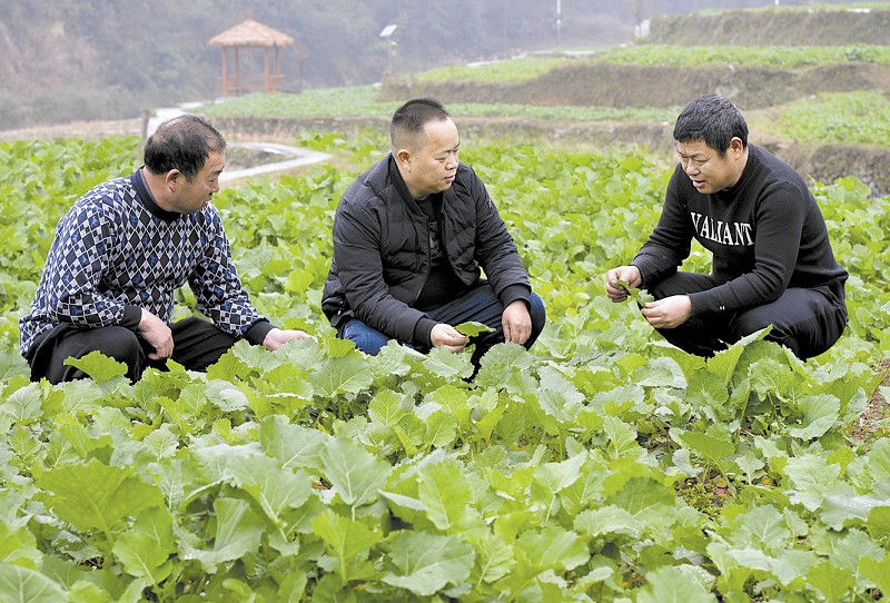 县农业农村局党组书记、局长肖新华(中)在东坪镇指导油菜培管。
