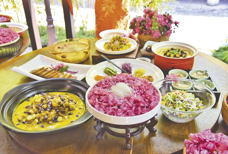 切菜、翻炒、出锅、摆盘……上午11时,厨嫂当家土菜研究院的后厨香味扑鼻,一场关于“木槿花全宴”的比拼热火朝天地进行,一盘盘原生态食材与木槿花融合,变成一道道美味佳肴。“木槿艳双雄”“衣槿昼游”“槿上添花”……一道道独具匠心、色味俱全、回味无穷的美食直击味蕾,让人垂涎三尺。