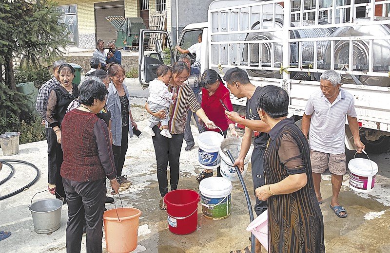 9月15日,安化县梅城镇黄泥村十一组村民周劲松启动水泵,从新开掘的水井里成功引水进入临时水塔,周边百户乡邻挑着水桶来担水,人畜饮水难题迎刃而解。