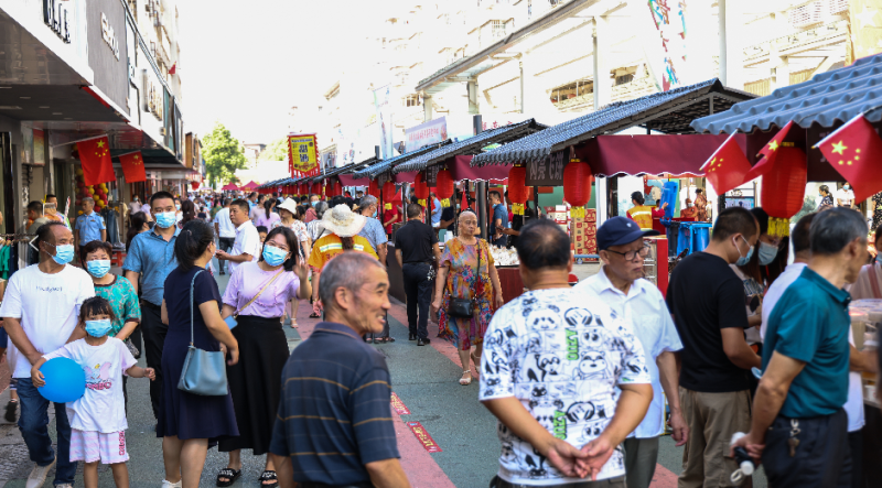 10月1日,益阳市商业样板街人流如潮。国庆假日第一天,许多市民游客来资阳区打卡特色小吃,品尝木槿美食。