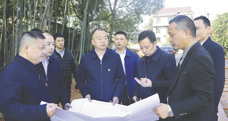 赫山区委书记周卫星(左四)调度园区项目建设。