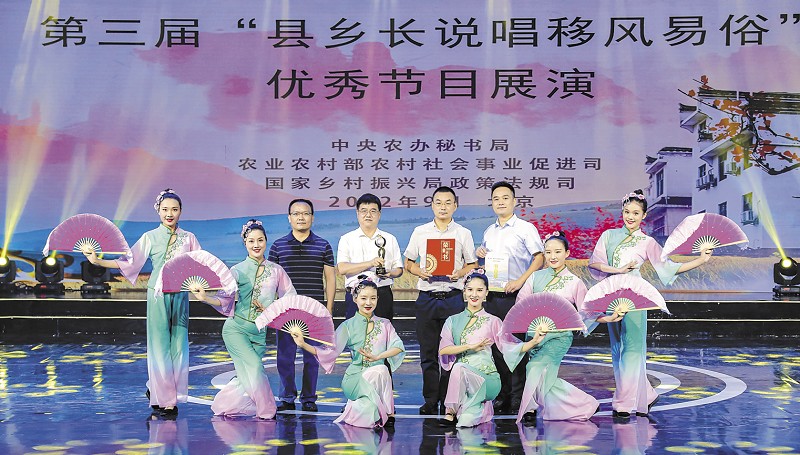 稻熟了,蟹肥了,棉白了。深秋的湖乡南县,正是丰收的季节。近年来,南县持续推进农村人居环境整治,南洞庭这片平原上星罗棋布的村庄,一个个变得更加生态、美丽、宜居。南县2020年获评“省政府真抓实干激励县”,2021年获评“省农村人居环境整治先进县”,有9个村获评“省级美丽乡村建设示范村”,2个村获评“省级特色精品乡村”。 9月1日,南县以反映人居环境整治提升、拒绝高价彩礼、推行厚养薄葬为主题创作的地花鼓表演唱节目《考镇长》,获评全国第三届“县乡长说唱移风易俗”优秀节目,赴京参加了由中央农办、农业农村部、国家乡村振兴局举办的展演活动。