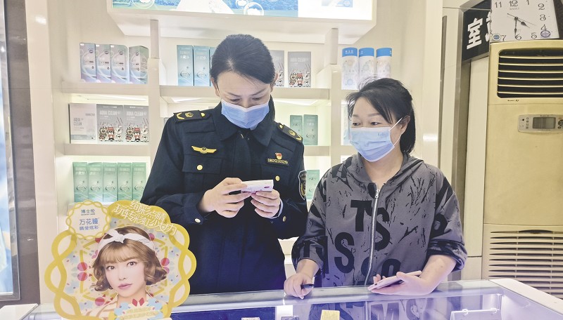 执法人员对一家眼镜店经营的装饰性彩色隐形眼镜进行检查。