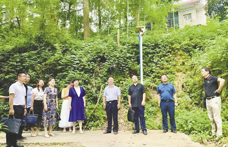 ▲县人大常委会主任伍令贤(中)率人大代表视察桃江一中。