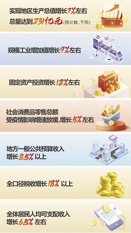 “2022年是党的二十大胜利召开之年,也是“十四五”规划深入推进的关键之年。一年来,我们团结带领全区人民,按照疫情要防住、经济要稳住、发展要安全的总体要求,坚持稳中求进,贯彻新发展理念,守住了不发生聚集性疫情底线,顶住了经济下行压力,维护了社会和谐稳定,经济社会发展总体平稳、稳中提质,人民群众获得感、幸福感、安全感持续提升。”