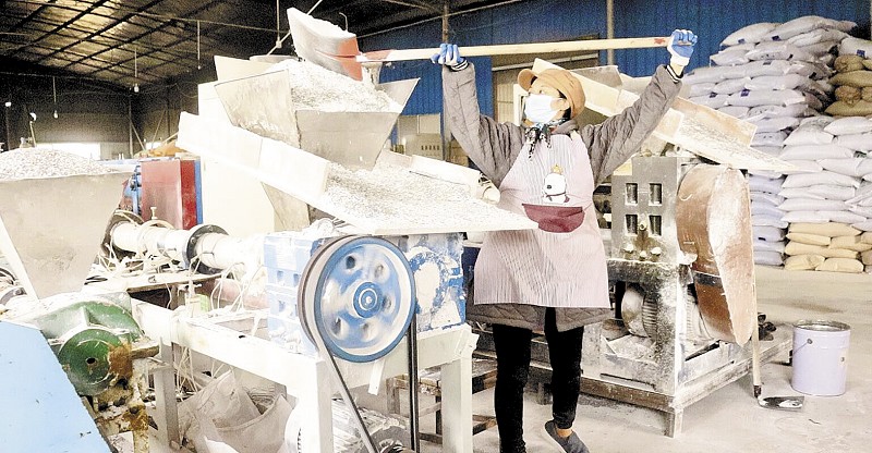 工作人员将废旧农膜粉碎形成的颗粒投入塑化机。