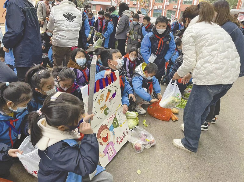 原来,这里正在开展“校园种植欢乐多,蔬菜义卖真情暖”活动。本学期刚开学的时候,老师带领学生在学校劳动基地种了不少蔬菜,大家精心呵护、悉心打理,菜园喜获丰收。15日上午,老师和同学来到菜园采摘,将新鲜蔬菜装袋并贴上价格标签进行义卖。同学们个个干劲十足,有的把宣传展板摆在醒目位置,有的细心地摘掉黄叶子,吸引参加义卖活动的老师和家长购买。活动现场叫卖声、欢笑声此起彼伏。“从亲手播种、浇水、施肥,到蔬菜成长收获,我感受到了劳动的快乐和收获的喜悦。”2001班学生刘嘉琪激动地说。