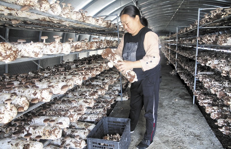 桃江县鸬鹚渡镇龙塘湾村脱贫户邓琼艳在食用菌培植大棚里采摘食用菌。