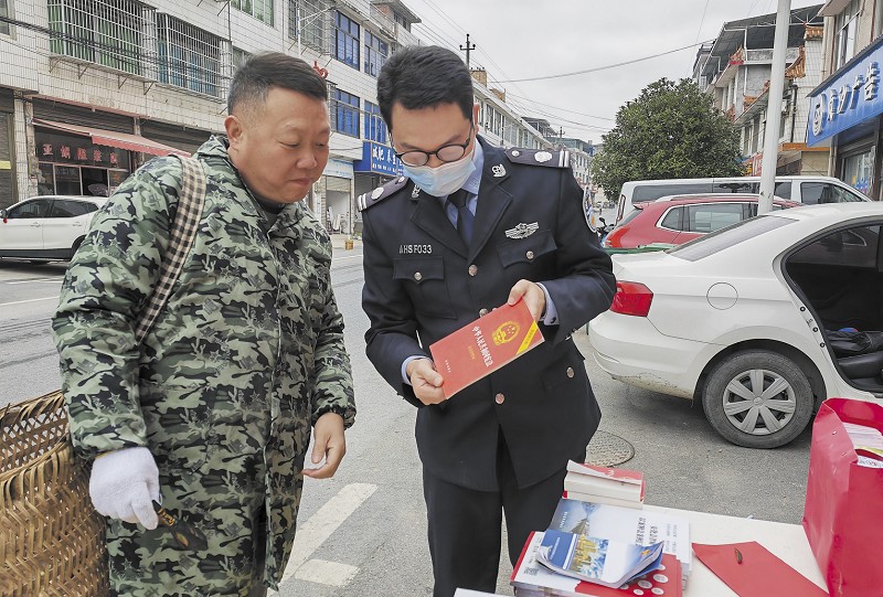 ▲工作人员向过往群众宣讲法律知识。