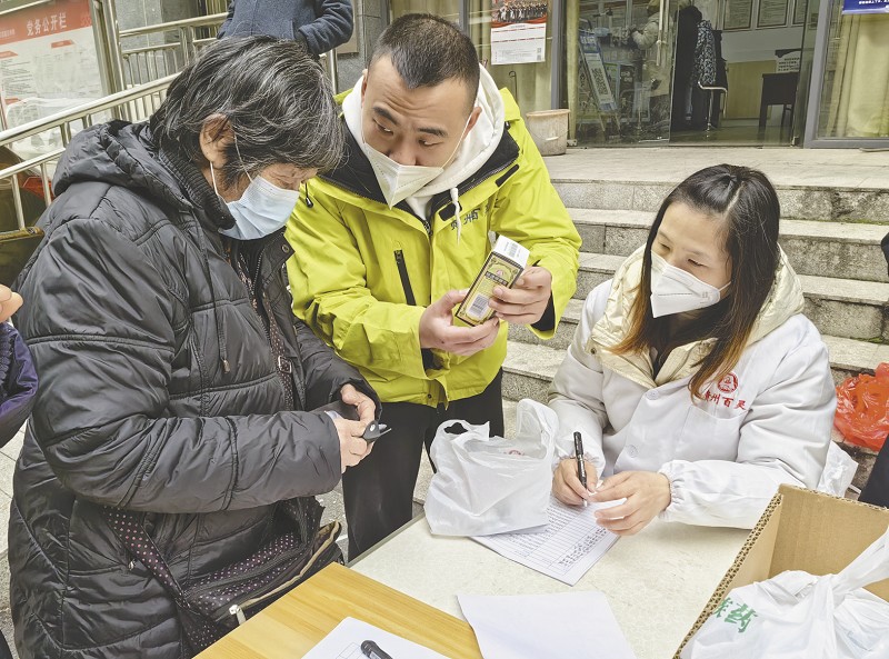 当天9时许,社区前坪,不少居民在此排队领取药物。工作人员兵分三组,一组负责药物装袋,一组负责登记发放,一组帮居民量血压、测血糖。药物袋里有咳速停糖浆、维C银翘片、双羊喉痹通颗粒,主要医治新冠病毒阳性患者后期的咳嗽、痰多等症状。“喉咙疼吃这个,咳嗽吃这个。”工作人员耐心给居民介绍药物的使用方法及注意事项,让不少人直呼“暖心”。