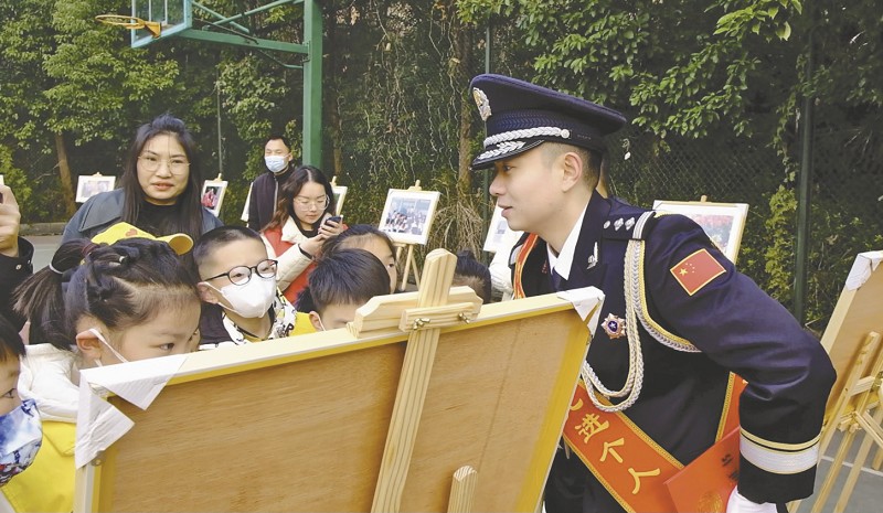 展览中,学生志愿者在反诈宣传、学雷锋等摄影作品前排起了长龙,拍照留念,现场气氛热烈。“长大后,我也要成为一名光荣的人民警察保护别人。”11岁的汤家欣说。