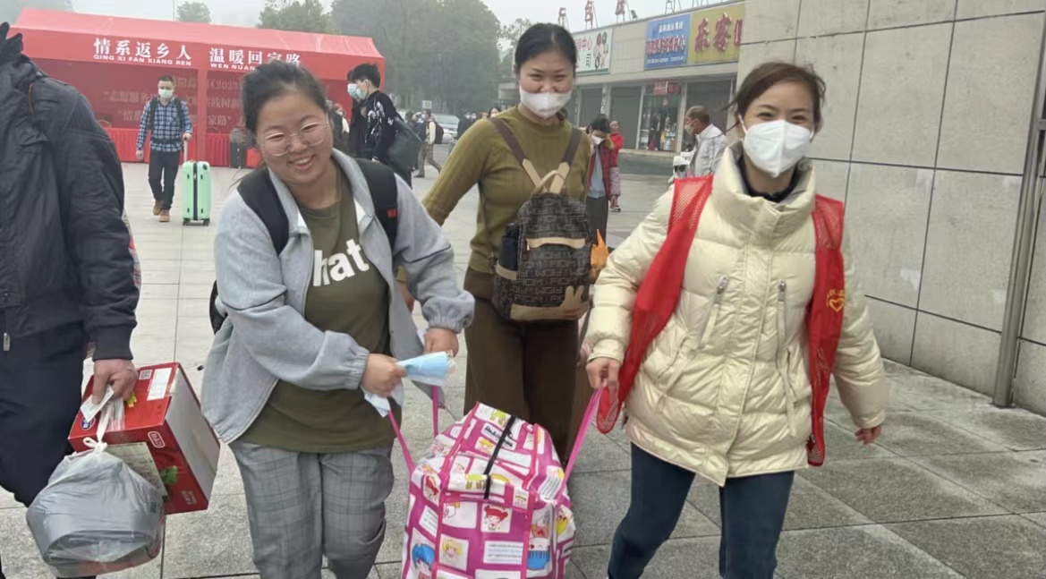随着列车的到站,出站口陆陆续续涌现了提着大包小包的返乡人员。在步履匆匆的返乡潮中,一群“志愿红”显得格外醒目。身穿红色马甲的志愿者分工明确,有的向出站旅客进行疫情防控知识宣传;有的向返乡人员详细讲解就业创业政策,并提醒大家注意返乡途中交通安全、春节期间提高防范电信诈骗意识;有的上前表明志愿者身份,帮助行李较多的老弱妇孺搬运行李,贴心提供乘车引导。同时,志愿者还给来往的旅客赠送“福”字、对联、口罩、矿泉水等“新春礼包”,为大家的返乡旅程增添了无限暖意。