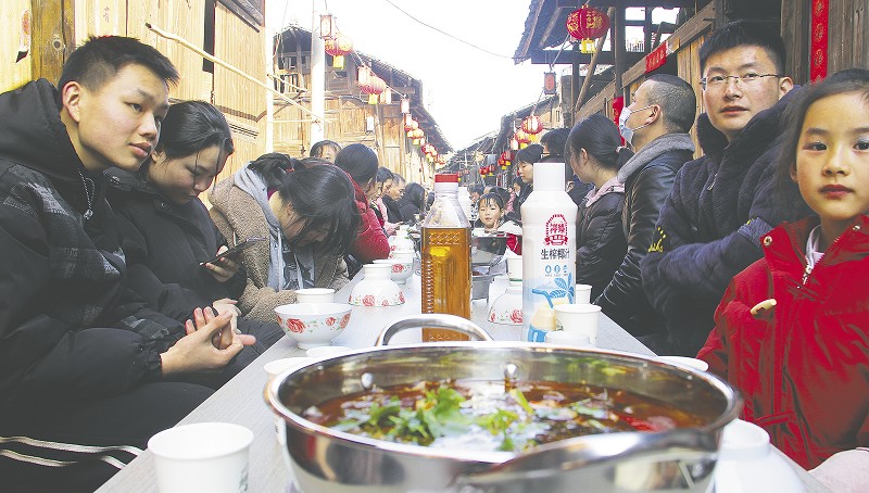 1月19日14时许,在安化县东坪镇唐市社区518米长的唐家观古街,100多张餐桌相连,从巷头摆到巷尾,近1000名群众与游客面带笑容坐在凳子上,期待长龙宴的开始。