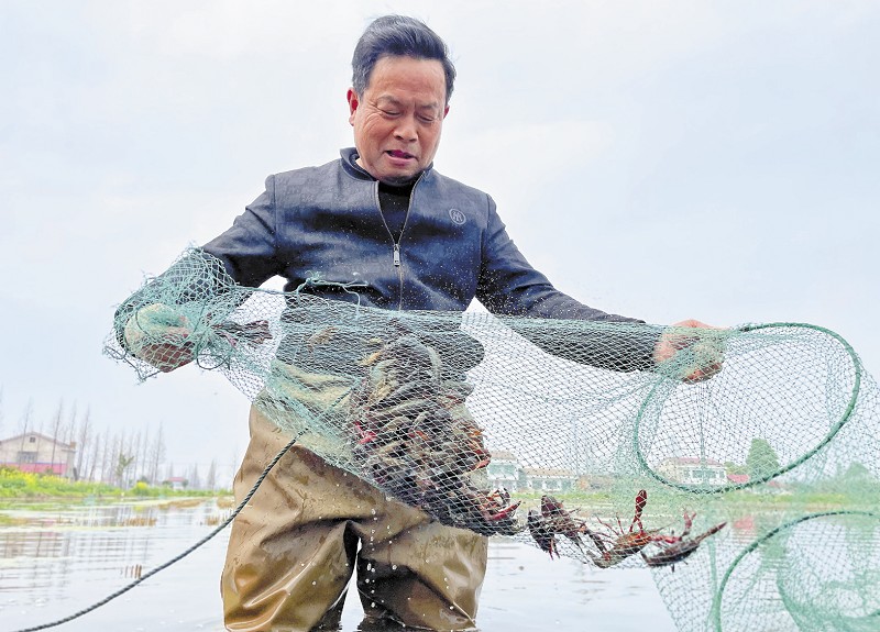 2月21日,南县青树嘴镇沙港市村的百亩稻虾田内,虾农朱胜利正在捕捞首批成品虾。由于水质的全面提升和科学合理的管护,今年他家的稻田虾上市时间早了近半个月,市场收购价是上市高峰期的近5倍,品相好的小龙虾收购价超过100元/公斤。
