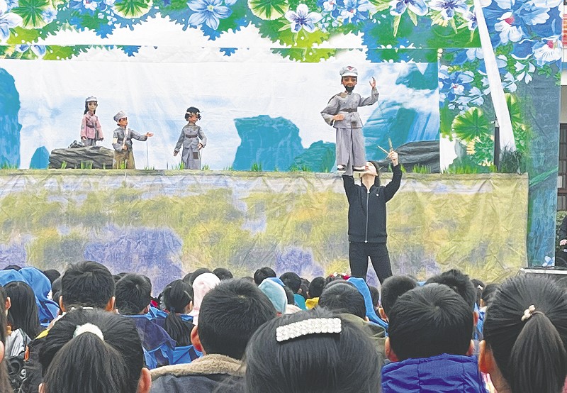 孩子们近距离观看木偶戏表演,感受中国传统艺术的魅力。