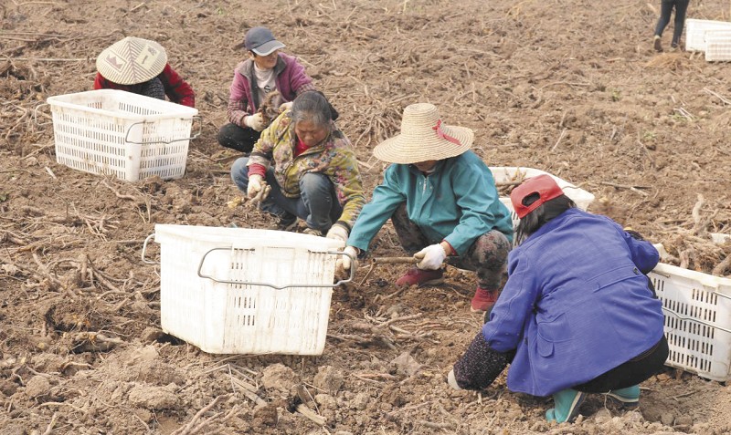 3月8日,南县厂窖镇西洲村虎杖种植基地内,50余名村民正在采挖虎杖,一筐筐已整理好的虎杖正等待着装车。“这批虎杖已经有厂家订购了,我们现在正在赶工,争取在今明两天完成出货。”种植者葛青洲在一边采挖药材,一边接受记者采访。