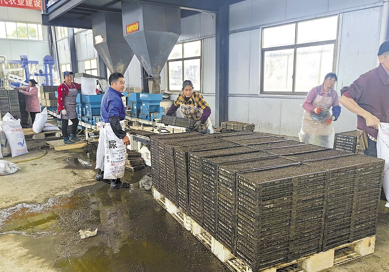 育秧现场机器轰鸣,一条水稻育秧生产线上,工人们将基质土和药剂浸泡后的稻种加入育秧机中,摆盘、撒土、浇水、撒种、盖土……一个个秧盘快速完成,再叠放起来,等待新苗破土而出。邱国清介绍,他家秧苗除了满足服务中心播种需求外,还要服务周边乡镇。“一条流水线一个小时可以播种1200个秧盘,一天运行8小时,就是将近10000个秧盘,可供500亩农田栽插。省时也省工,质量也好,播下去均匀,出苗整齐。”