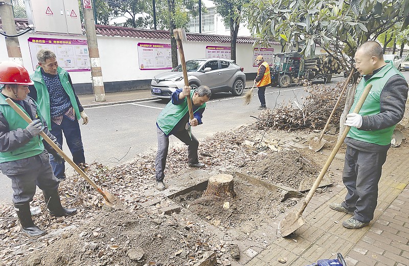 “轰!”近日,赫山区赫山街道人大巷内一棵枯死的行道树在工人的砍伐下倒地。连日来,赫山区城管执法局组织工人对辖区背街小巷枯萎、缺株行道树进行更植补种,预计更植补种约200余株。