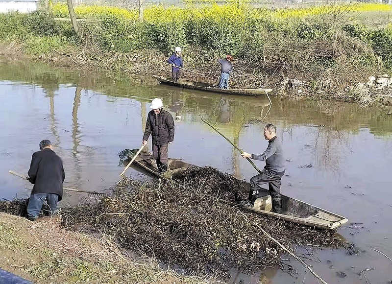 村民对河道中的枯草、淤泥等堆积物进行清理。