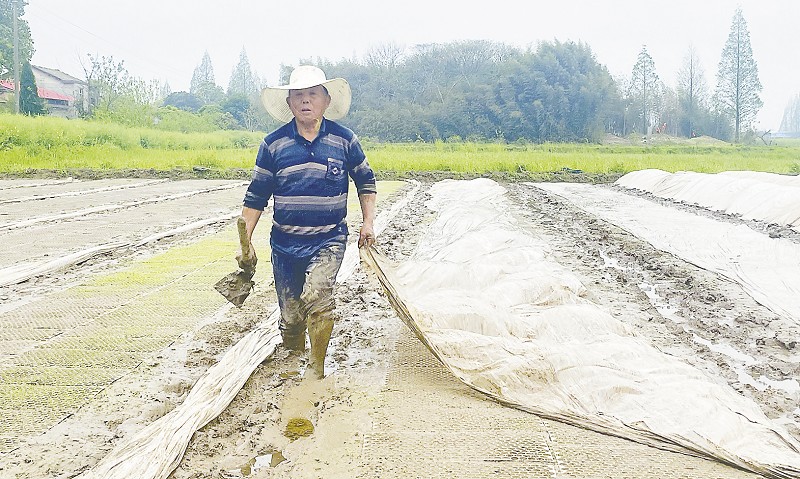 春雨来势急,田间覆膜忙。在茅草街镇八百弓村,村民徐天佑冒雨来到田间,一边听着镇农机专家刘十红的指导,一边在田间仔细检查每一片地膜是否压实、牢固,挥动锄头疏通地膜间的排水沟,仔细检查了一遍,防范夜间暴雨给秧苗的生长带来不利影响。徐天佑说:“幸好刘专家昨天来告诉我天气预警的消息,不然这次大雨,我这田里不晓得要死多少秧苗。”