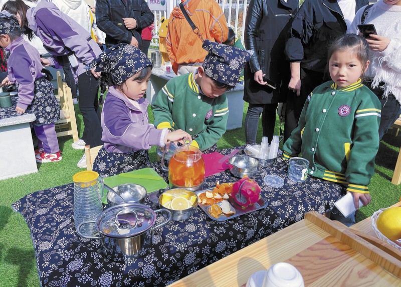 茶艺区,大班的孩子们系着茶艺围巾,头戴茶艺帽立在一边,有模有样地斟起茶来。这些孩子从认茶叶、识茶具、学茶礼开始,将制作茶、招待客、品尝茶的一系列生活技能娴熟地在“掌中开花”,引得观摩群众一致叫好。湘味版的“茶颜悦色”尽收眼底。
