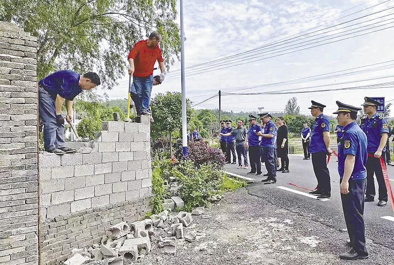 近段,桃江县相关部门工作人员在执法过程中发现,崆峒村某村民在桃益大道南侧违规搭建围墙,经调查认定,当事人未依法取得《建设工程规划许可证》等相关手续,且存交通安全隐患,于是依法对当事人下发停工整改文书,但当事人没有整改,而且没有停工。经相关部门联合执法,终于拆除违建。