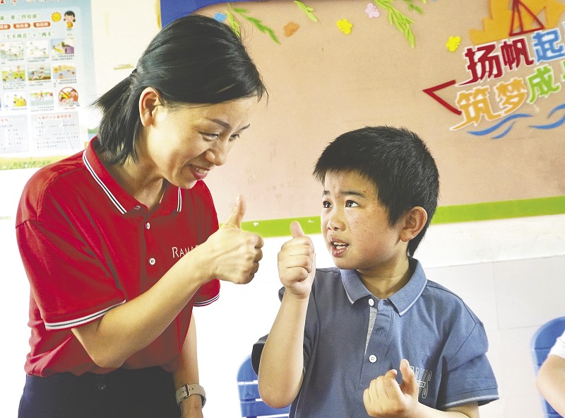 志愿者带领学生做手势操。