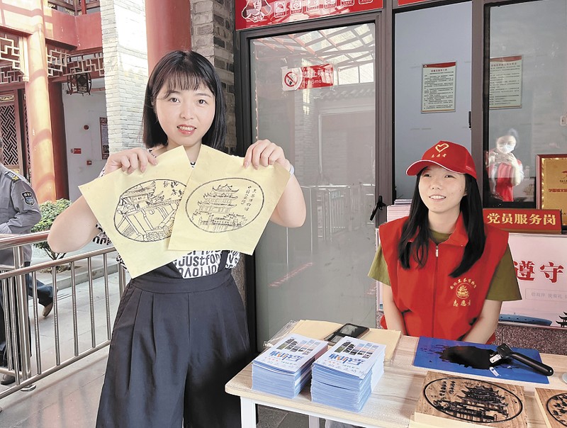 游客展示雕版印刷作品。