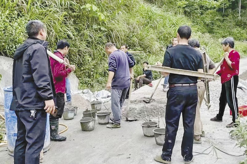 5月18日,在安化县高明乡眉毛村瓦子坪组,工程车往来穿梭,村民自发组成施工队伍浇筑路面水泥。