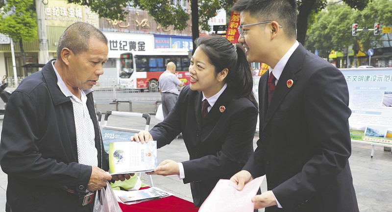 “对破坏生态环境的违法行为,我们将依法提起民事公益诉讼,责令违法行为人承担损害赔偿和修复受损生态环境的责任。”6月5日,在桃江县桃花江镇花桥路,一名检察官向过往群众讲解非法捕捞需要承担的法律责任。这是桃江县检察院联合市生态环境局桃江分局、桃江县环境保护协会开展“世界环境日”主题宣传活动的一个镜头。