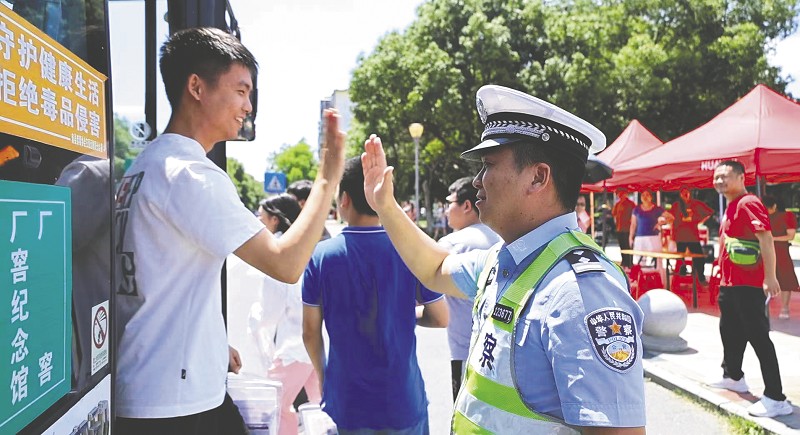 “祝你们高考成功。”6月7日,在南县一中校门口公交站,南县公安交警大队执勤民警赵勇伸出右手,和走下车的学生们一一击掌,为他们加油打气。