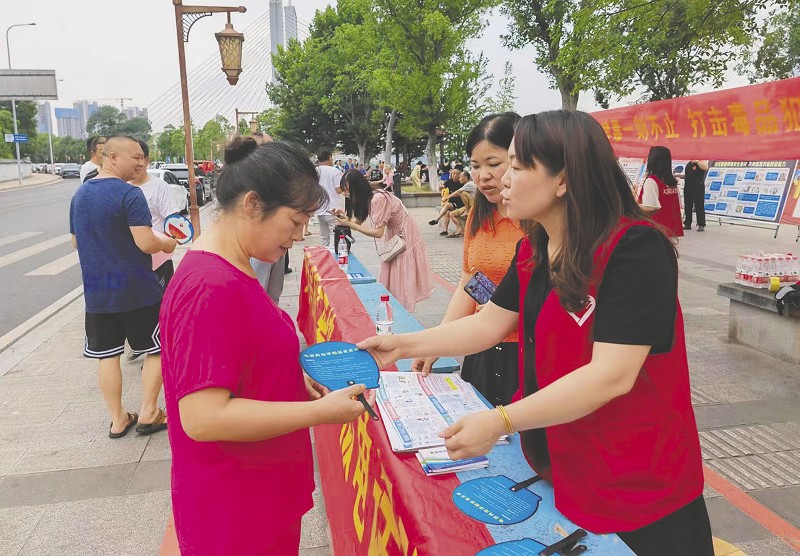 桃花仑街道办工作人员向群众发放反诈拒毒等宣传资料。