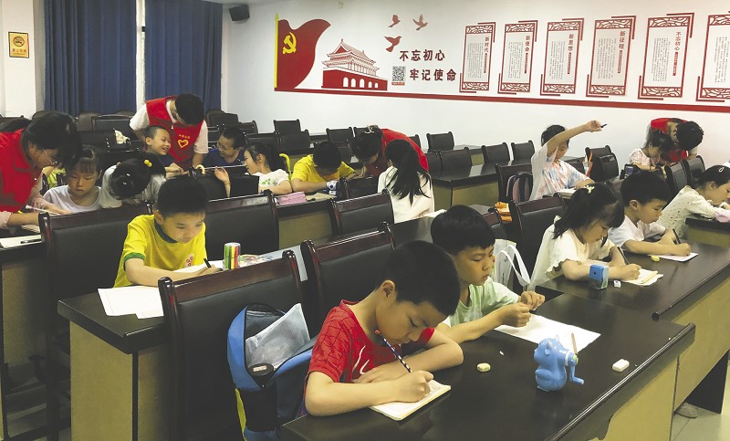“周老师,你看看我写的这幅字!”“有很大的进步,继续加油。”6月11日,赫山区桃花仑街道大渡口社区新时代文明实践站活动室内,湖南工艺美术职业学院的大学生志愿者正指导社区儿童写书法。这是社区“艺术课堂”服务辖区孩子的一幕。