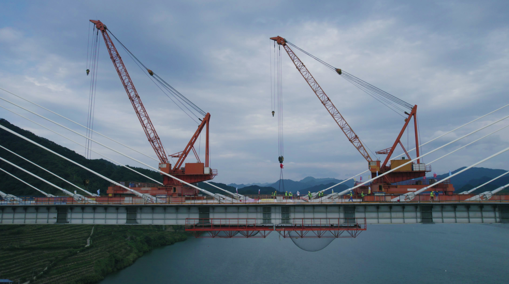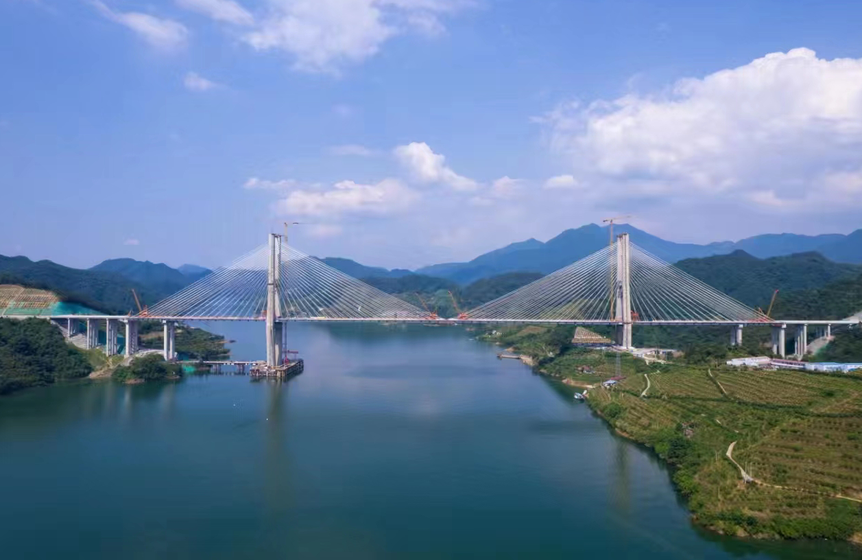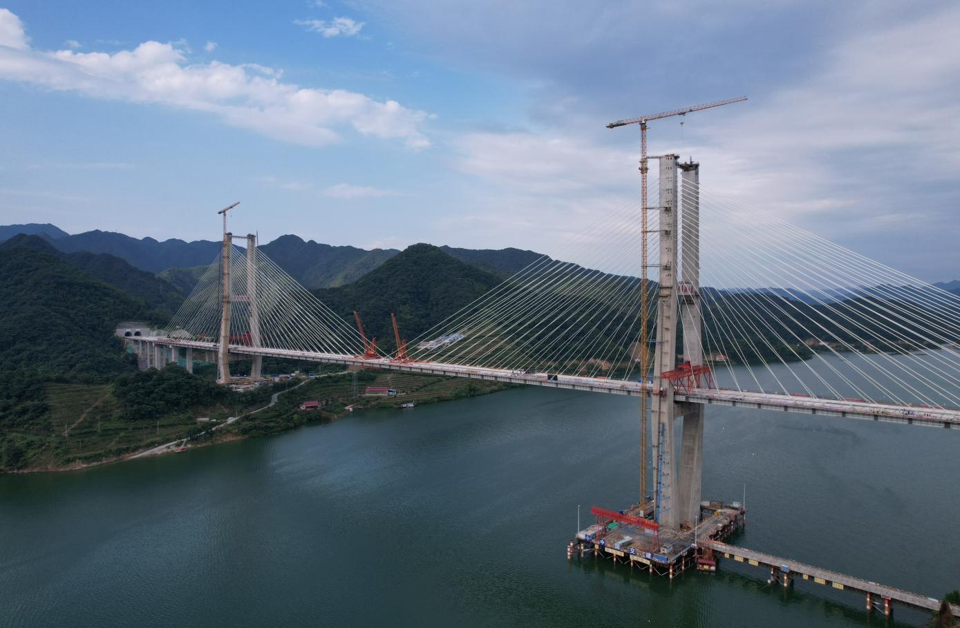 据了解,雪峰湖大桥自2021年2月第一根桩基开钻,到2022年9月双索塔柱封顶,再到昨日大桥成功合龙,建设者面对山岭库区作业面狭窄、高度落差大等复杂地形挑战,攻克了库区深水陡坡裸岩钢管桩和钢护筒施工技术,在国内首次应用“坦克轮步进式顶推”施工工艺,完成引桥钢梁顶推施工任务,大桥塔柱施工采用高索塔泵送混凝土施工技术,实现202.4米高塔混凝土泵送零堵管的良好效果,通过BIM建模推演主桥施工全过程工况,实现复杂结构及复杂工序交底可视化。