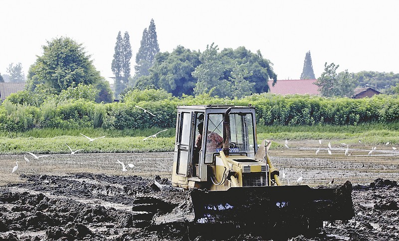 上图:白鹭在翻耕机旁觅食栖息。