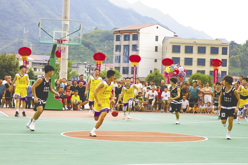 开幕式上,各村(社区)代表队、镇政府代表队、县第三人民医院队共16支球队依次入场。他们将带来64场不一样的比赛。首场比赛由孟家木溪队对战同心队。“黄队,加油!”老乡们的欢呼点燃全场。没有看台、没有座位,男女老少或蹲或站或席地而坐;抱着娃的、骑着车的、吃完饭出来散步的,都激动地呐喊助威。能在家门口为自己村的球队加油,乡亲们觉得劲头十足。场上运动员个个斗志昂扬,精彩的转身、精准的跳投、机智的错位防守,加上配合行云流水,看得大家热血沸腾。场下,呐喊声、助威声、加油声,此起彼伏。