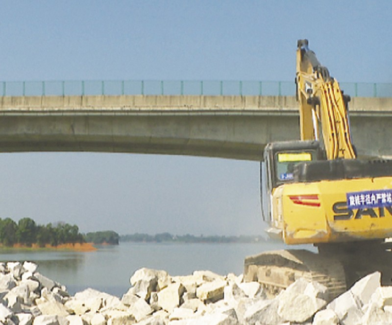 进入主汛期,沅江市抢抓有利时机,对长春垸一线防洪大堤开展抛石护脚。这是湖南省洞庭湖区重点垸堤防加固一期工程,是国务院部署实施的150项重大水利工程之一,也是今年重点推进的55项重大水利工程之一,被列入2022年湖南省十大基础设施项目清单。竣工后,不仅能提高洞庭湖区防洪抗灾能力,还有广泛的社会效益和良好的经济效益。图为8月4日,施工人员在沅江市琼湖街道小河咀村大堤外抛石护脚。