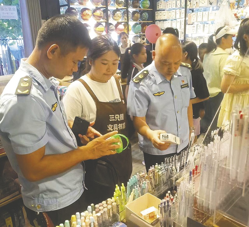 执法人员深入三益小学、五福路小学、益阳万源明达高级中学等多所中小学校周边的文具店、便利店、小卖部、小超市等经营场所,重点检查书包、中性笔、2B铅笔、文具盒、橡皮擦、修正液、作业本等学生需求量大的文具用品,是否有产品检验合格证、安全警示标志,标签标识是否齐全及符合相关规定,是否存在销售“三无”产品、假冒伪劣产品、不符合国家强制性标准产品,是否存在以盲盒、抽奖等形式引诱儿童学生购买文具玩具等违法行为。同时,仔细查看经营者证照、供应商资质、进货票据、进销台账等相关资料,督促经营者严格把好商品进货关,坚决防止劣质、“三无”、有毒有害等存在问题的文化文具用品流入校园。对检查发现的个别商家存在进货手续不齐全等问题,执法人员要求经营者迅速整改。