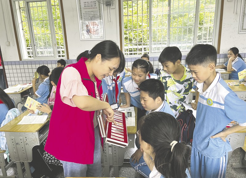▲禁毒志愿者通过仿真毒品展示向学生们宣传禁毒知识。