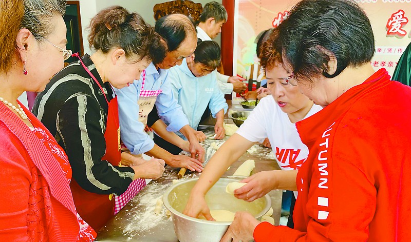 上图:众多老人围在桌子前包饺子。 刘行剑摄