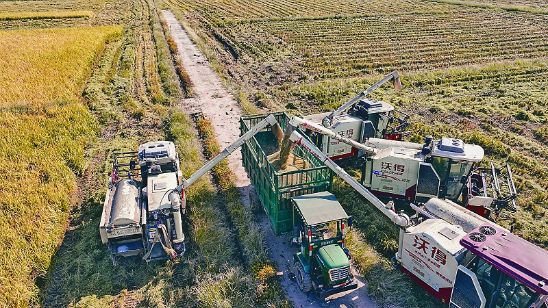 稻田里,沉甸甸的稻穗压弯了腰,田间地头弥漫着稻谷的清香,五台收割机摆开作业,收割、脱粒、装车……一气呵成,30分钟便轻松完成了40亩稻田的收割。“今年我种了1300亩晚稻,气候比较好,加上采用新机具、新技术、新产品的‘三新’配套技术,从种粮、施肥到收割的核心环节均实现机械化,效率大幅提升,品质得到保障。亩产预计可以达到550公斤左右,总产值预计可以达到140万元。秋收以后合作社计划种植绿肥紫云英来提高土壤肥力,实现化肥减量增效。”北洲子镇强农农机专业合作社负责人沈文超介绍。