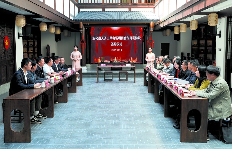 除了做强黑茶企业,2022年9月,安化县梅山城投集团与长安湖南新能源科技有限公司成功签订大峰山和久泽坪风电开发项目合作协议。项目充分利用安化县本地的优质风能资源,能有效缓解用电和节能减排压力,满足电网电力负荷增长需求,对优化安化县能源结构、助力“双碳”目标达成、推动经济社会发展具有积极意义。