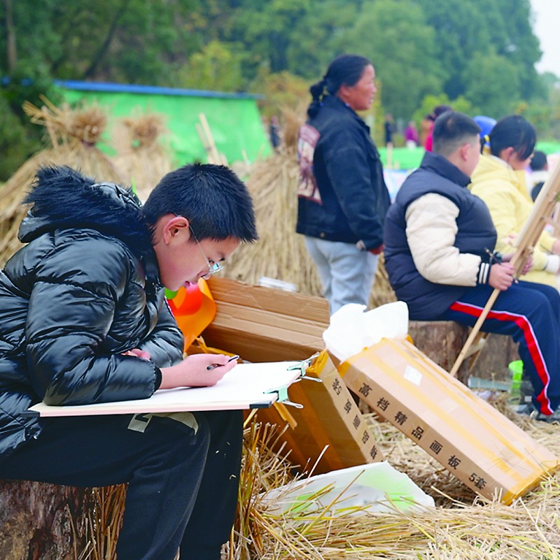 益阳师范七年级学生舒紫淇和6岁的弟弟,在爸爸妈妈的带领下,在稻田里支好了画架,拿出水彩,面对眼前的田野托腮思考。“还是画牛和草垛吧。”她对爸爸说。她身后的草垛间,挂了几幅萌萌的画作,几位老人家弯腰在看。
