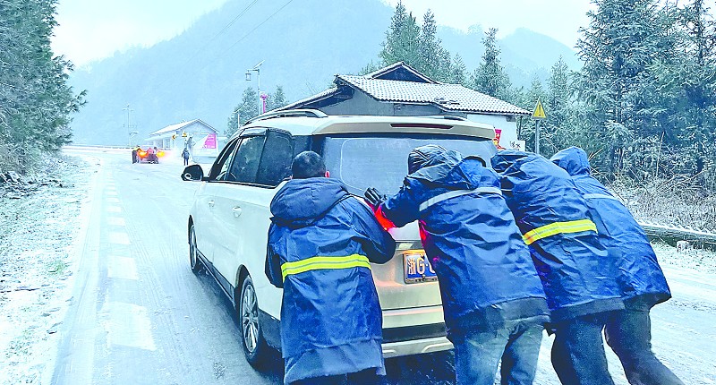 安化马路镇工作人员为返乡人士除雪推车。(安化县委宣传部提供)
