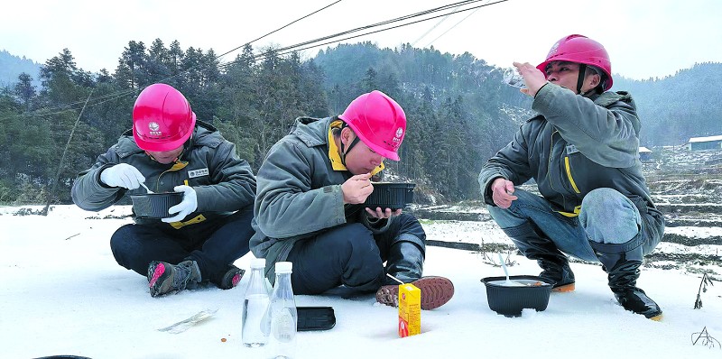 2月6日,在10千伏田木线304线路杨泥田支线,负责电力保障的国网安化县供电公司工作人员在雪中席地而坐吃起简易午餐。(安化县委宣传部提供)