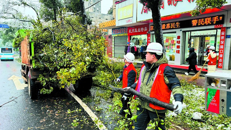 2月7日,在赫山区桃花仑东路,赫山街道工作人员积极清理掉落在行人道上的树枝,确保市民安全出行。刘行剑 摄